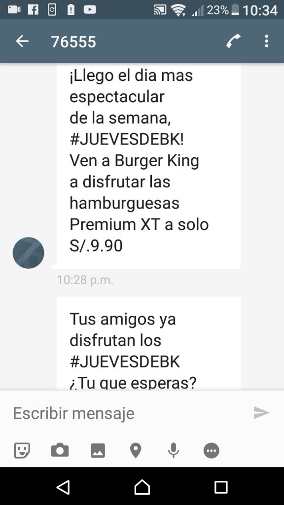 Burger King a través de nuestra plataforma de Mensajería de Texto desarrollo su Campaña «Jueves de BurgerKing» a través de ella, se creo campañas dirigidas a sus potenciales clientes que vivían o trabajaban en las cercanías de sus locales. De esta forma, las campañas eran recibidas por sus comensales en horas especificas con el fin de inducir a la compra.